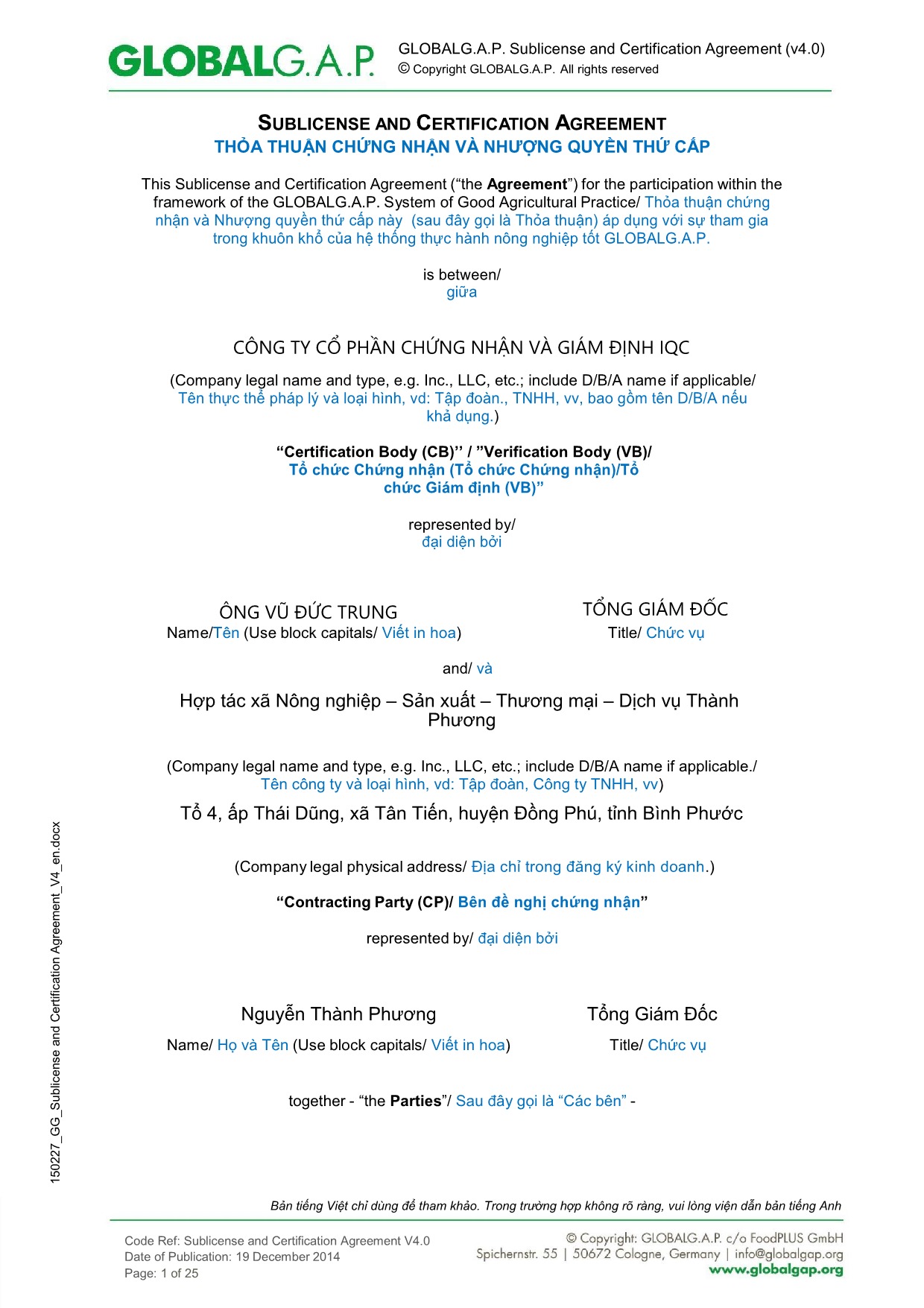 Giấy chứng nhận chuẩn GlobalGAP của Nông Trại Sunfarm Bình Phước