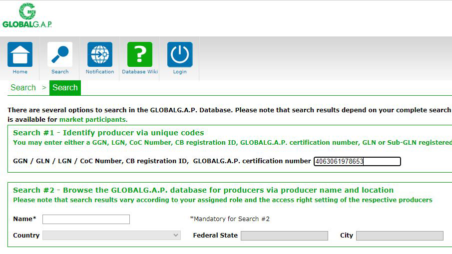 Tra cứu mã GGN của Sunfarm trên hệ thống Database của GLOBALGAP